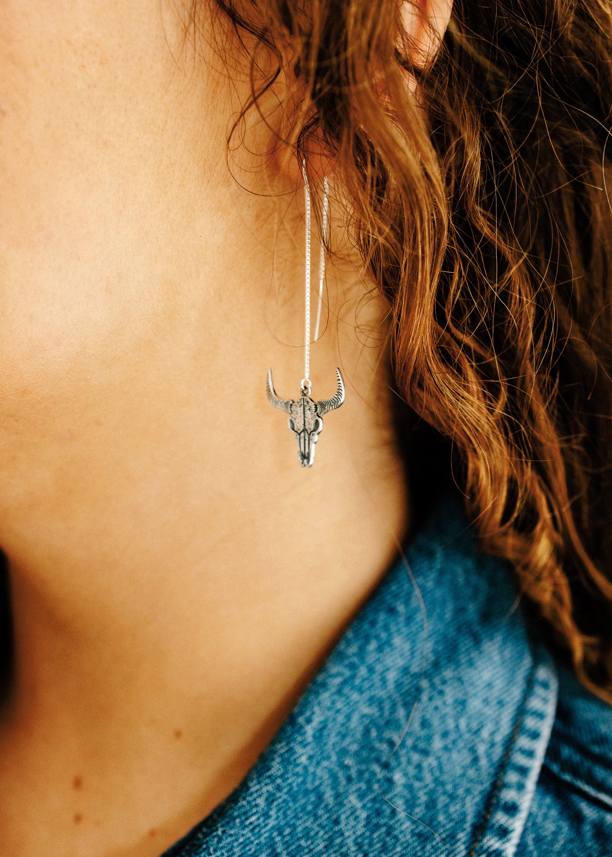 The exquisite Cowpoke Earrings showcase two beautifully polished two-dimensional cow skull charms in luxurious sterling silver. Strung upon a slim Sterling silver earring thread, these earrings catch light with every step. It's a statement piece that adds a touch of western edge to any ensemble.