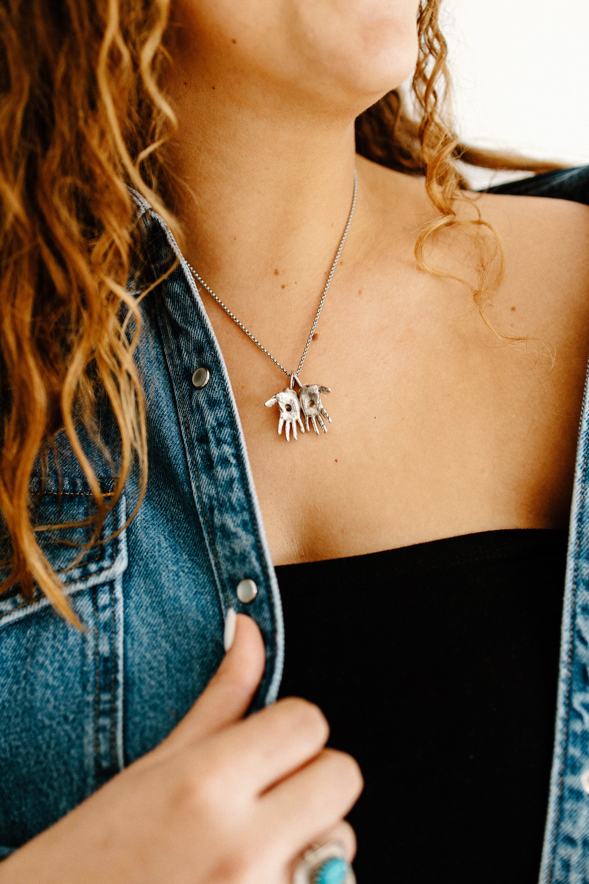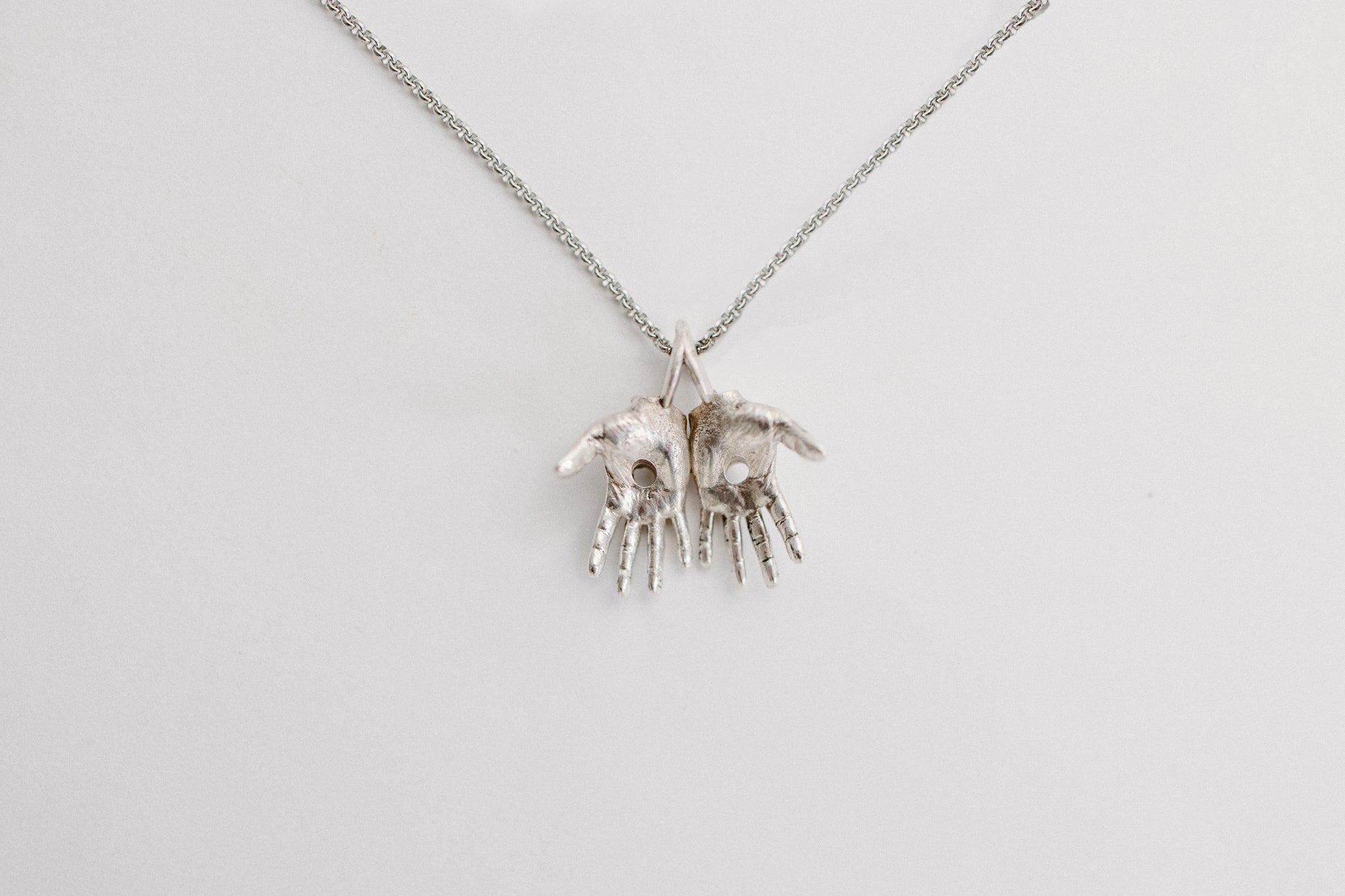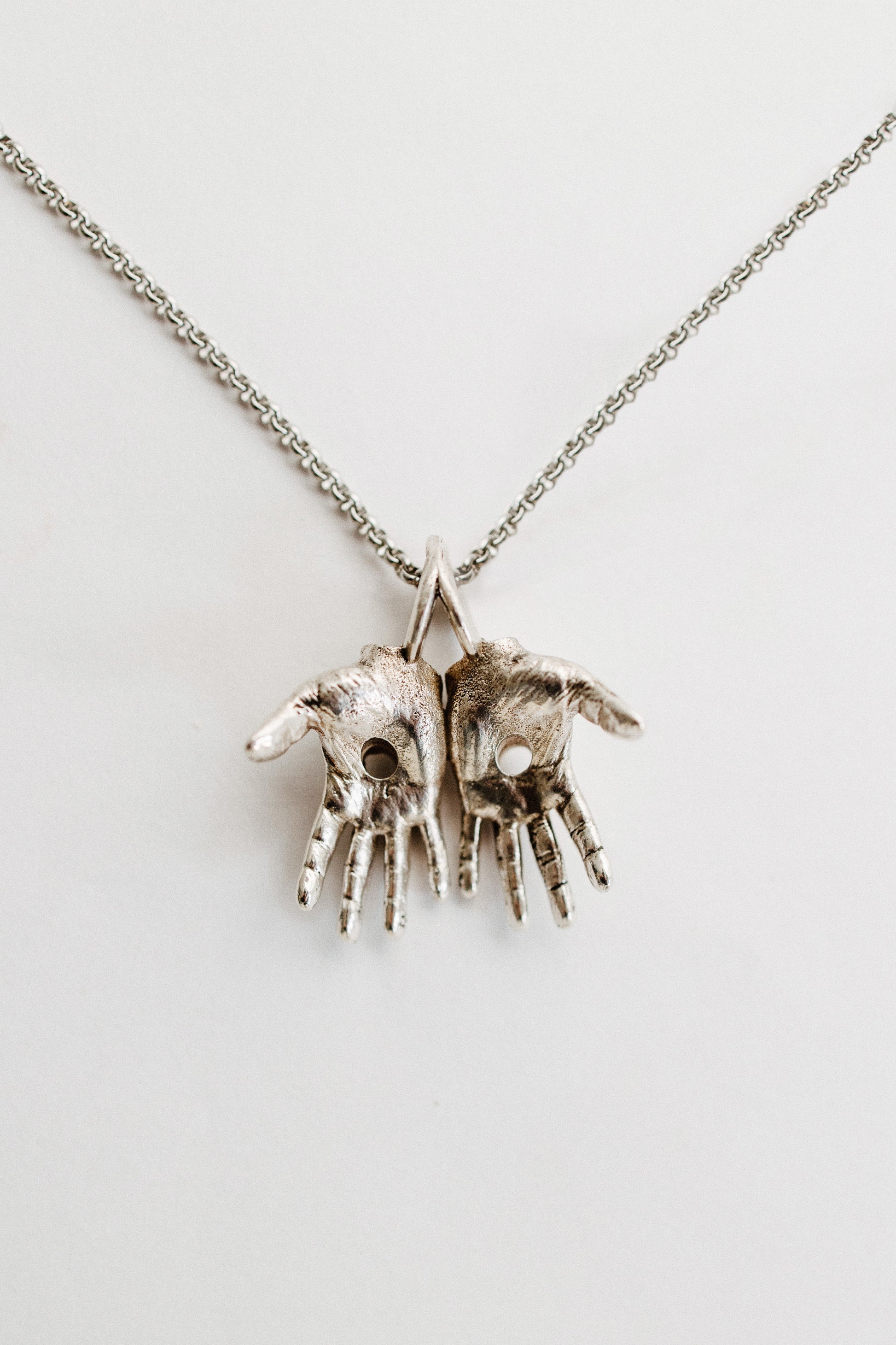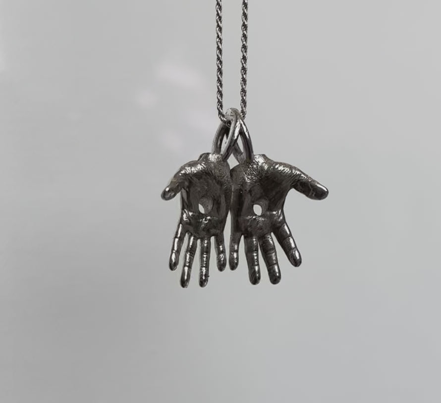 Worn close to the heart, His Hands Necklace serves as a daily reminder to have faith in the God that "so loved the world, he gave his one and only son, that whoever believes in him shall not perish but have eternal life"(John 3:16). Crafted with details of the holes from the nails driven into His hands during the crucifixion, this necklace celebrates His ultimate victory as He rose again. The outward facing, open hands represent that anyone and everyone who believes in Him is welcome in the Kingdom of God. This necklace most importantly serves as a conversation piece. It invites the wearer to share the gospel with whoever chooses to inquire about it. That said, this piece is meant to be worn with purpose and pride. Made in premium sterling silver, this piece will last and can be passed down for generations to come.