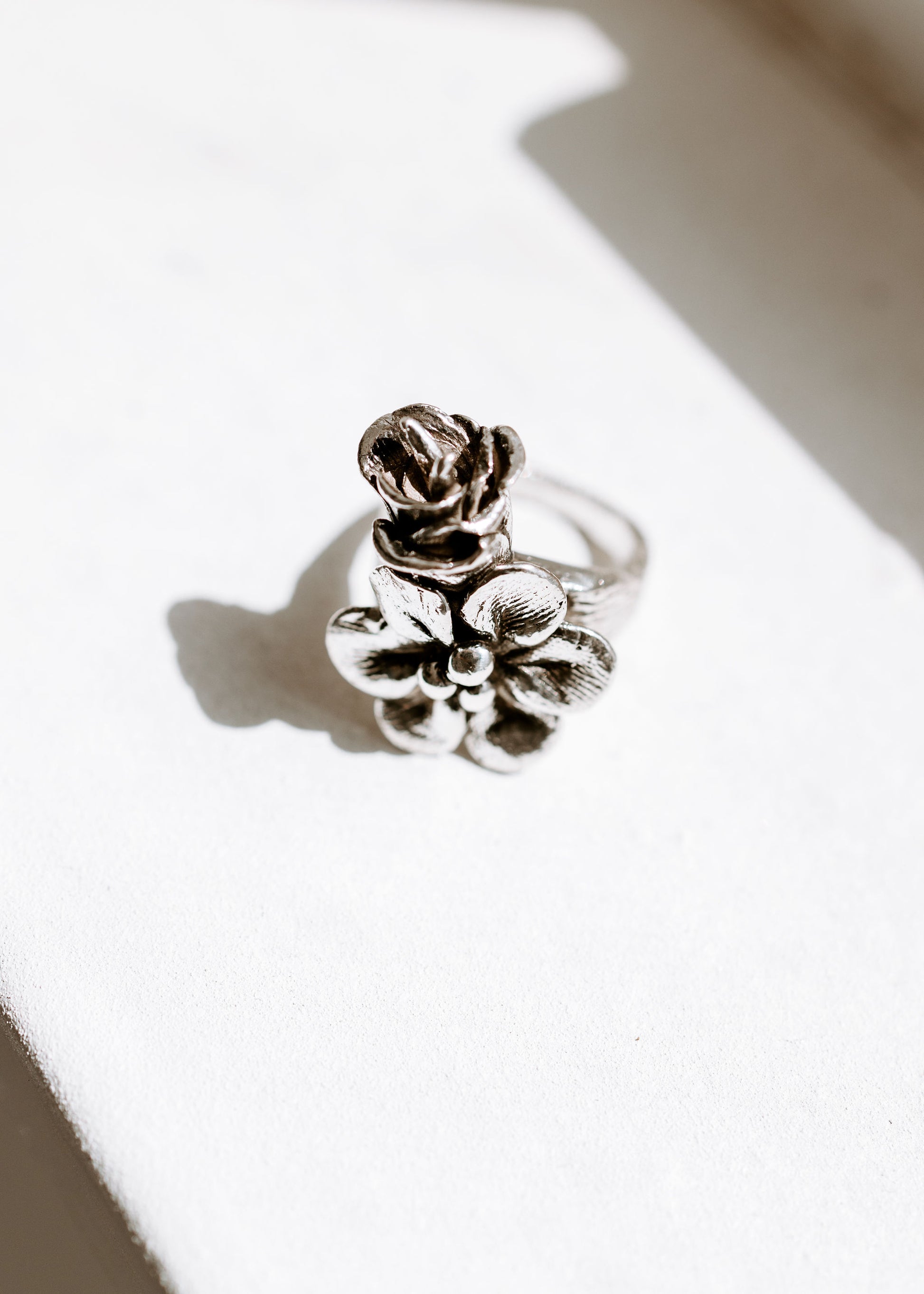 This handmade ring is a beautiful addition to any jewelry collection. Crafted from Sterling Silver, it features a delicate floral design, making it a timeless accessory that will be sure to add the perfect touch of femininity and fun to your wardrobe.