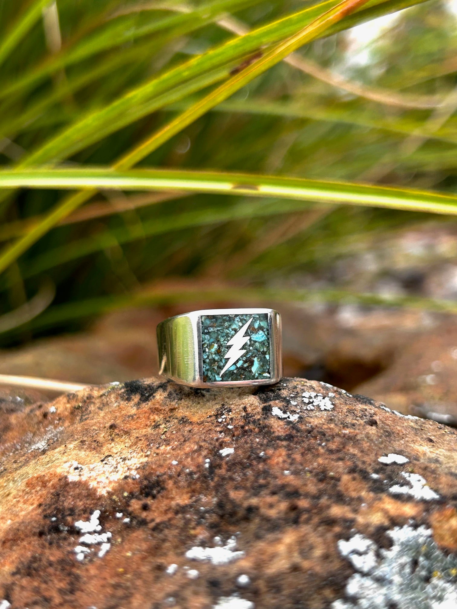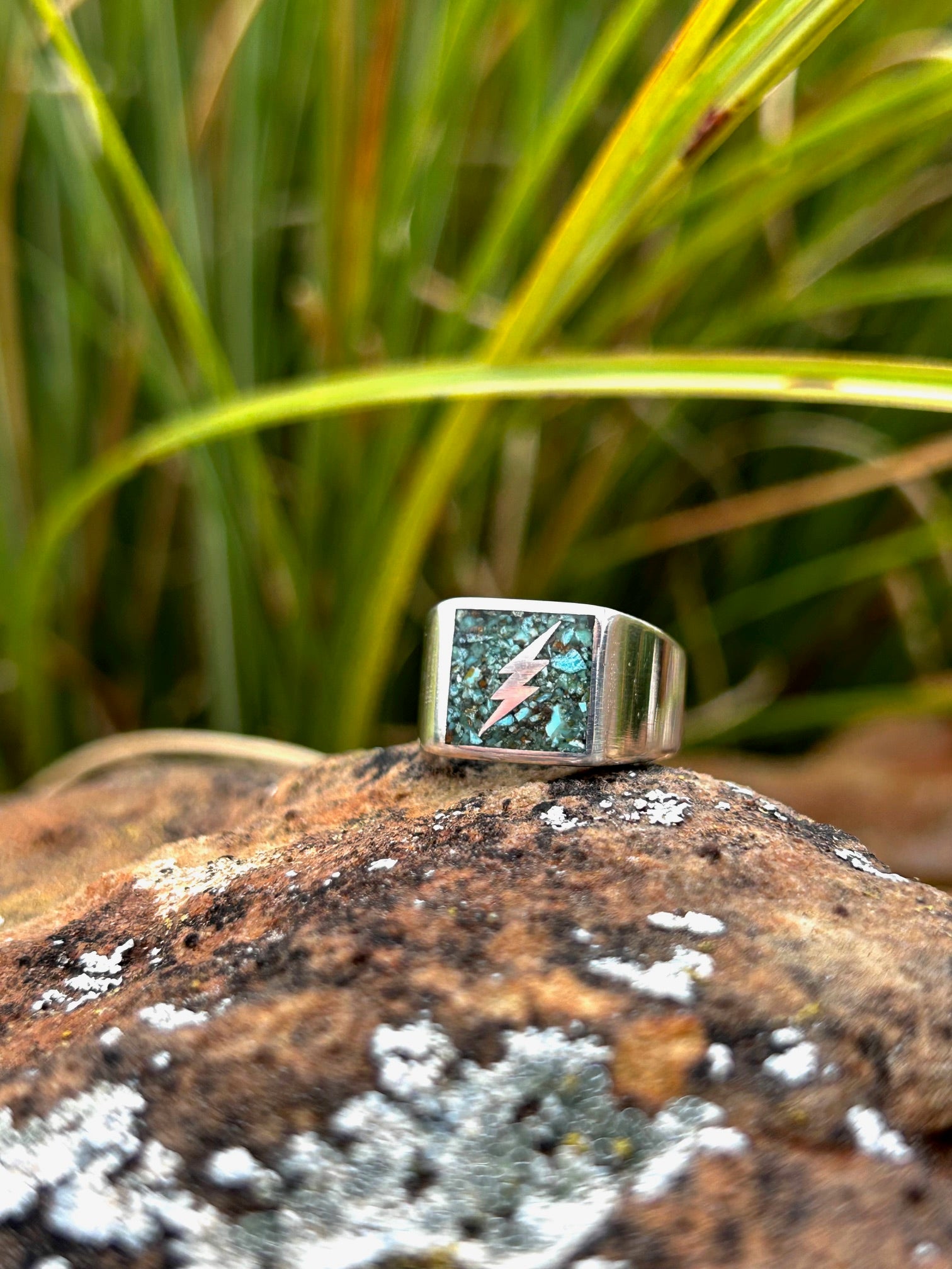 This handmade sterling silver signet ring is the kind of piece that fits right into your daily lineup — easy to wear, hard to miss. Featuring a crushed natural turquoise inlay for a striking finish, this ring is comfortable, stylish, and effortlessly cool.