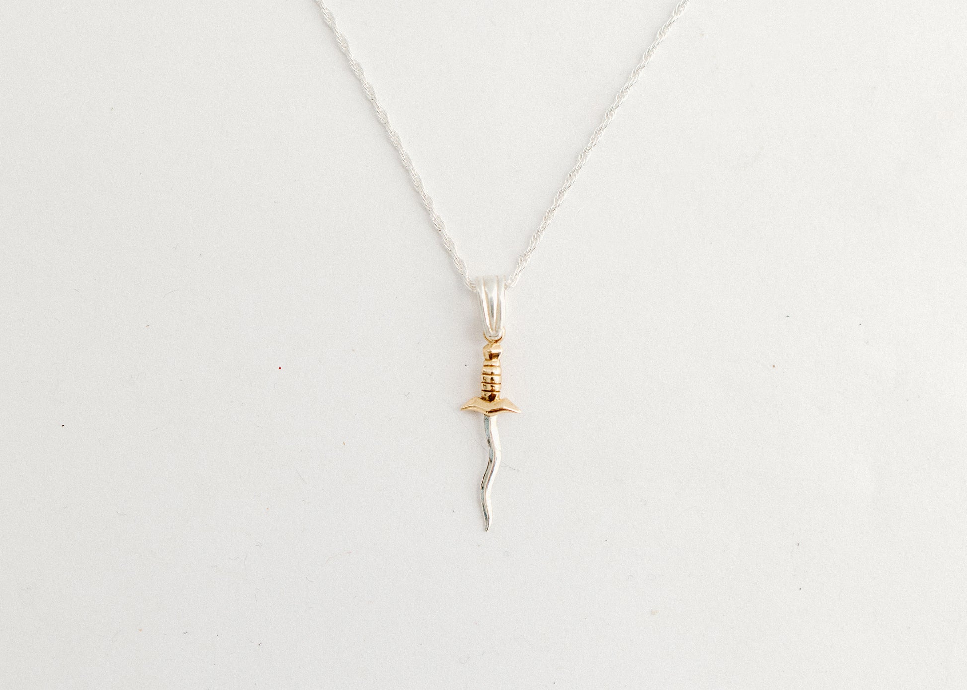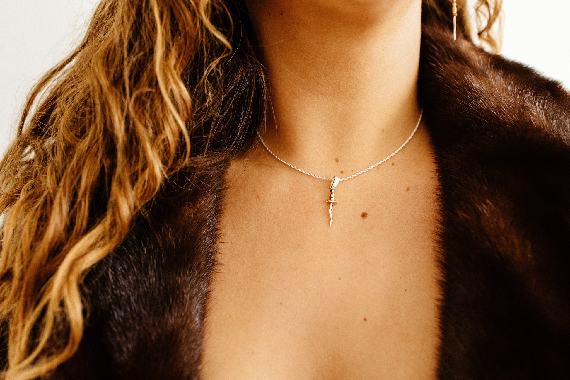 Featuring a Sterling silver dagger and a brass handle, the Silver Dagger Necklace makes a bold statement that is perfect for any cool-girl. Includes a Sterling silver adjustable French rope chain. Complete the set with the Silver Dagger Earrings!