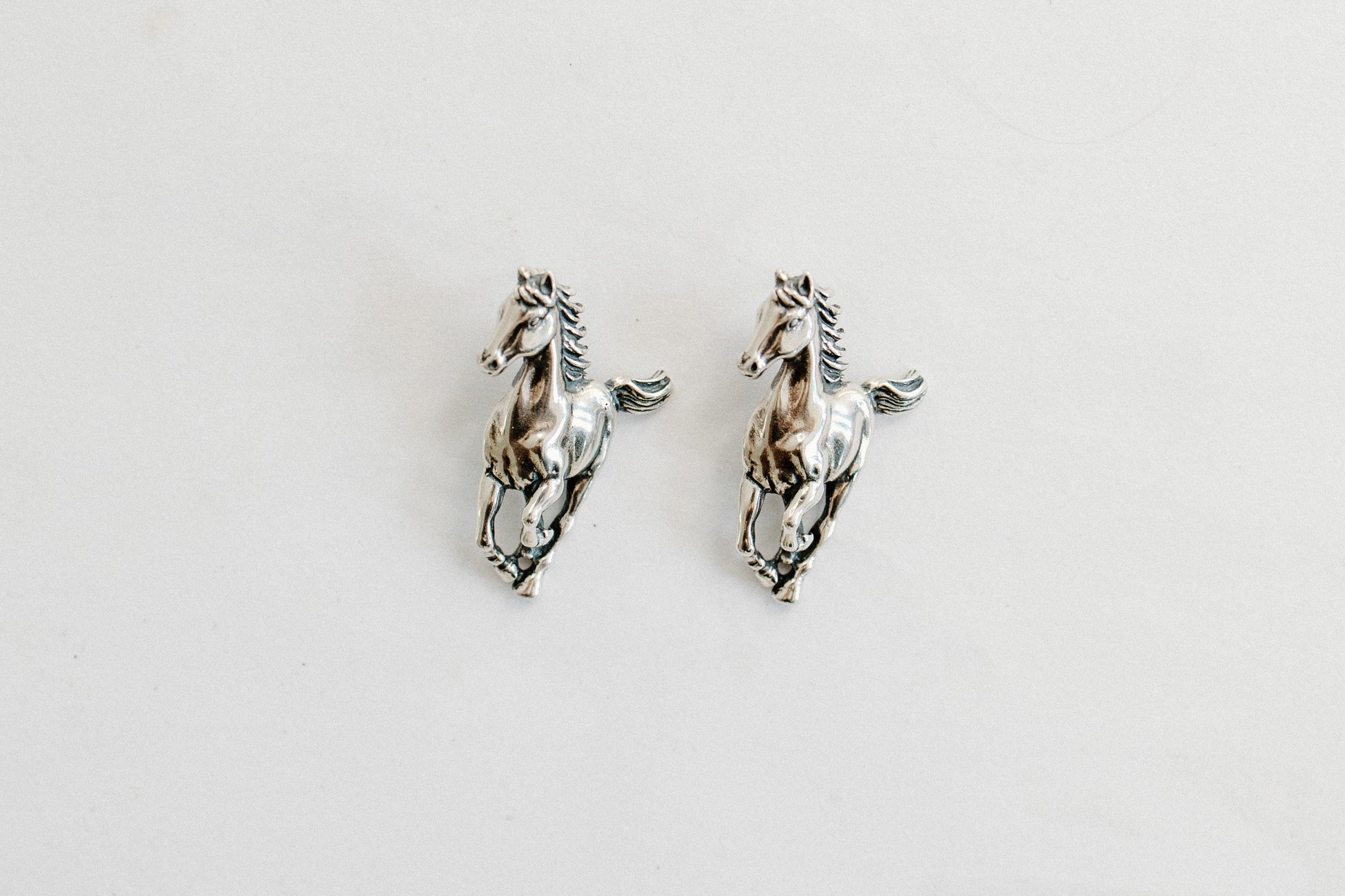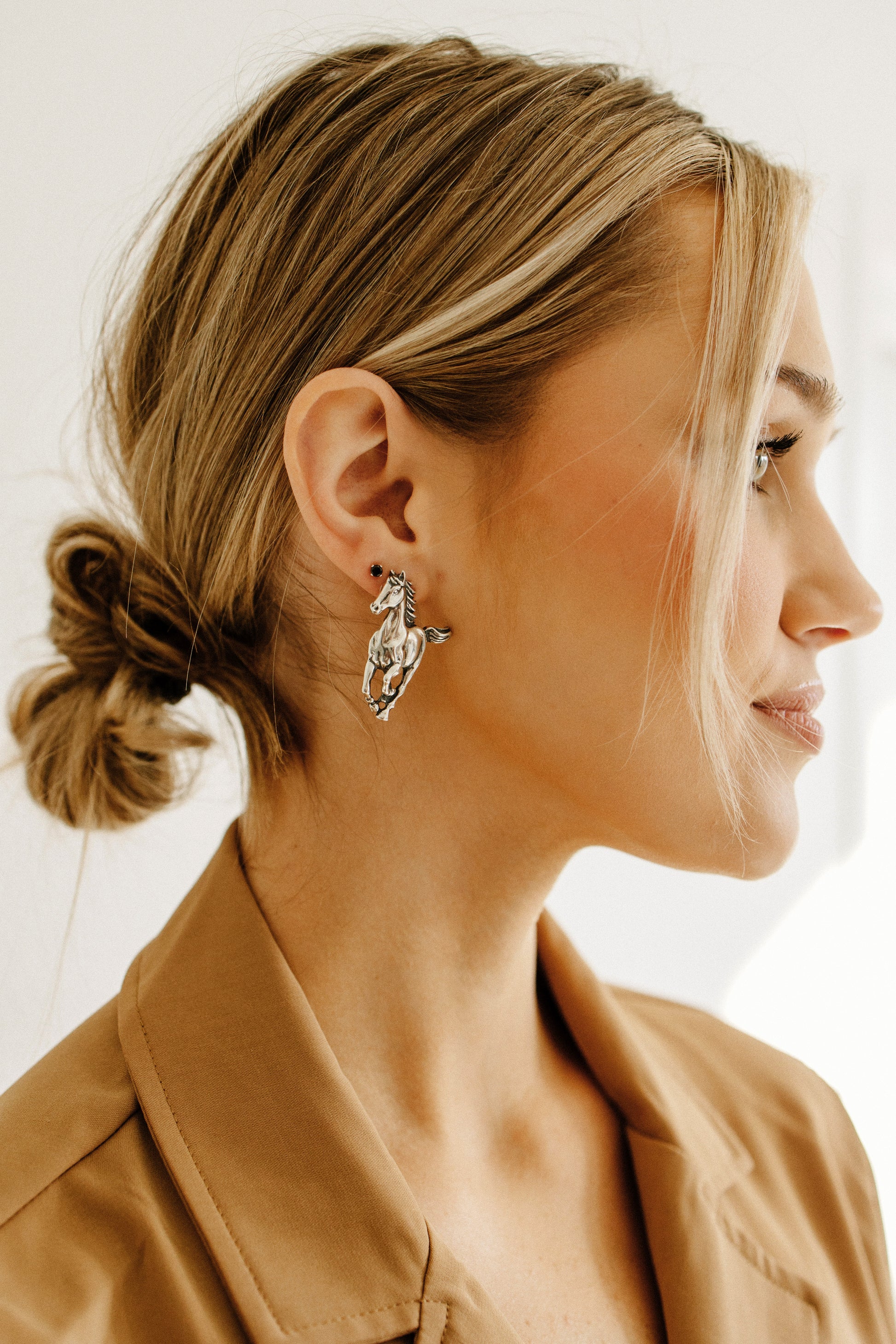 The Horse's Name is Friday Earrings are crafted from captivating Sterling silver. These statement earrings embody the spirit of a powerful stallion in motion. Perfect for those who are always one step ahead and unafraid to make a bold statement. A perfect accentuation of the strength and beauty of the wearer.